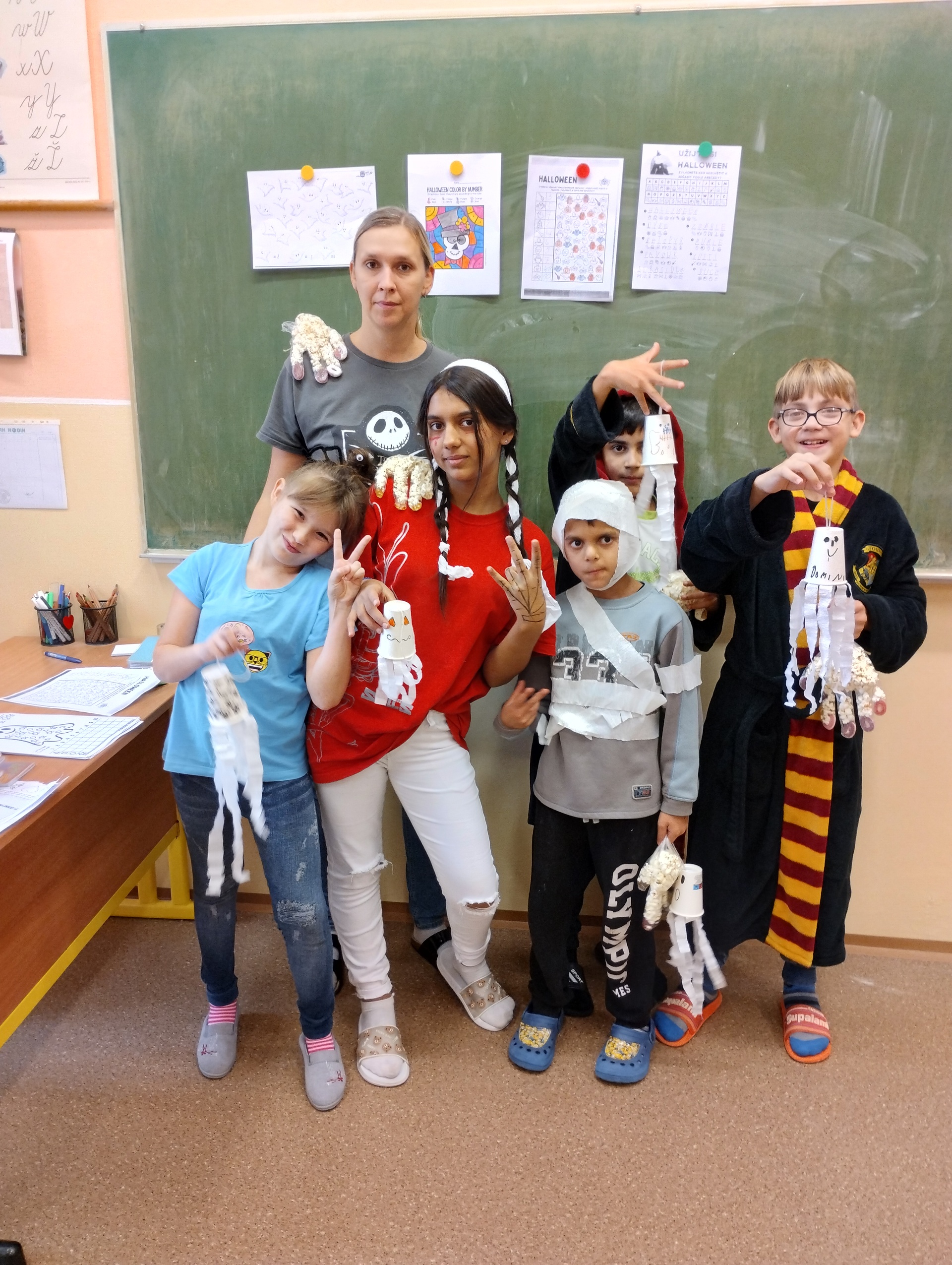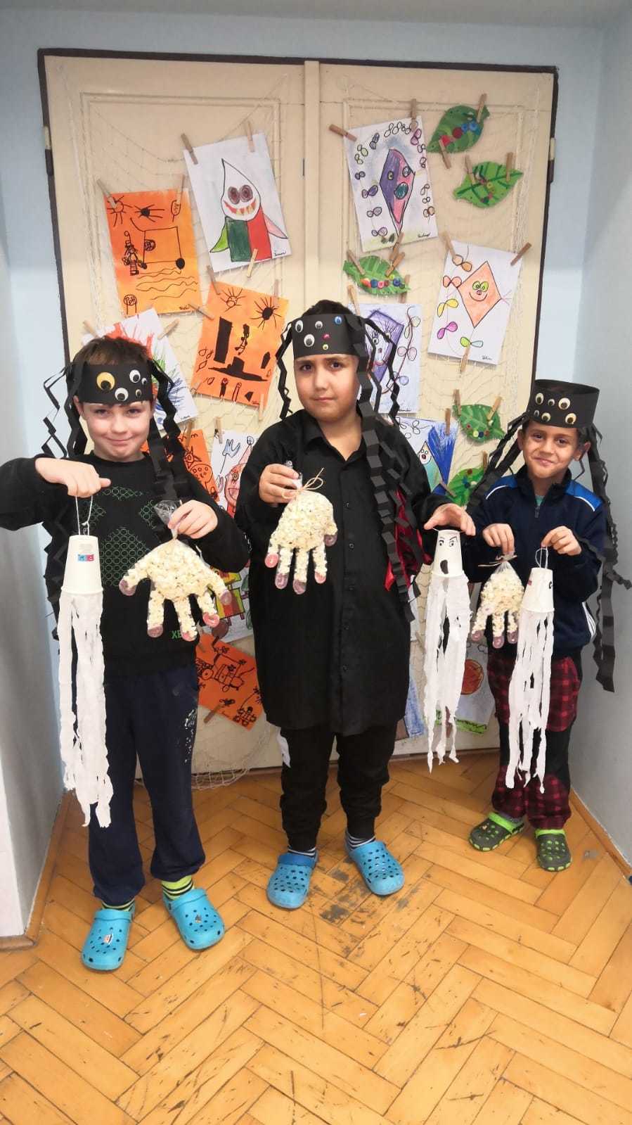 Po podzimních prázdninách jsme si se žáky prvního stupně uspořádali halloweenské dopoledne. Děti nejprve vyráběly masky, strašidla a převleky. Potom plnily různé kvízy, tajenky a pracovní listy, které souvisely s Halloweenem. Po splnění všech úkolů jsme se sešli v hudebně, kde pokračovala zábava formou soutěží dvou skupin. Dopoledne jsme zakončili diskotékou v maskách. Všichni jsme si dopoledne užili.