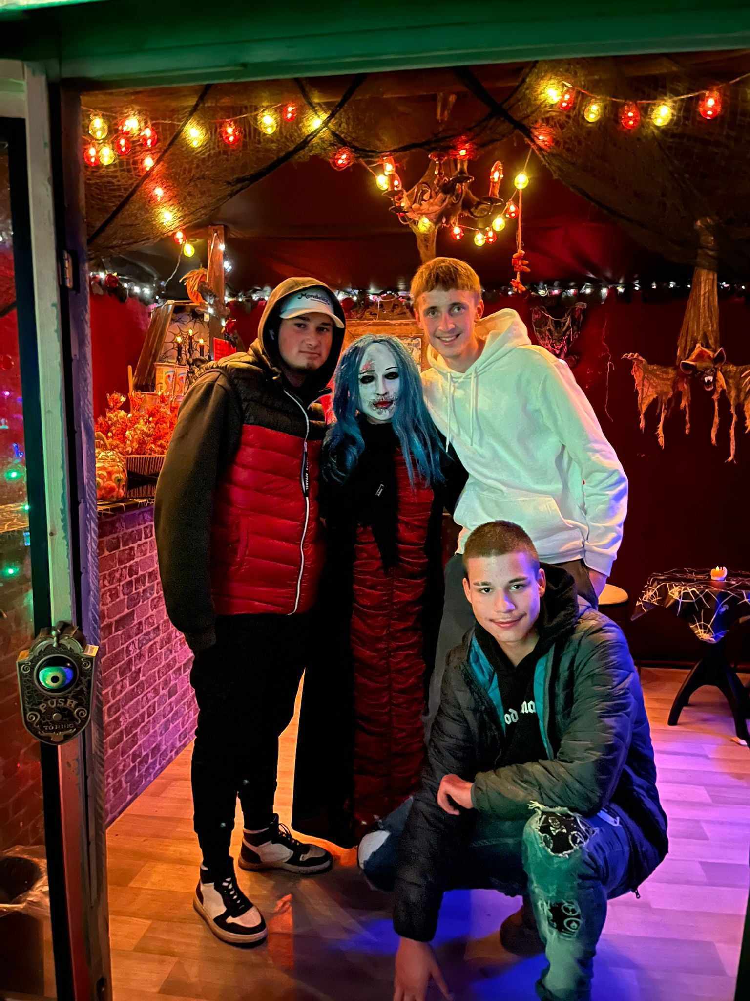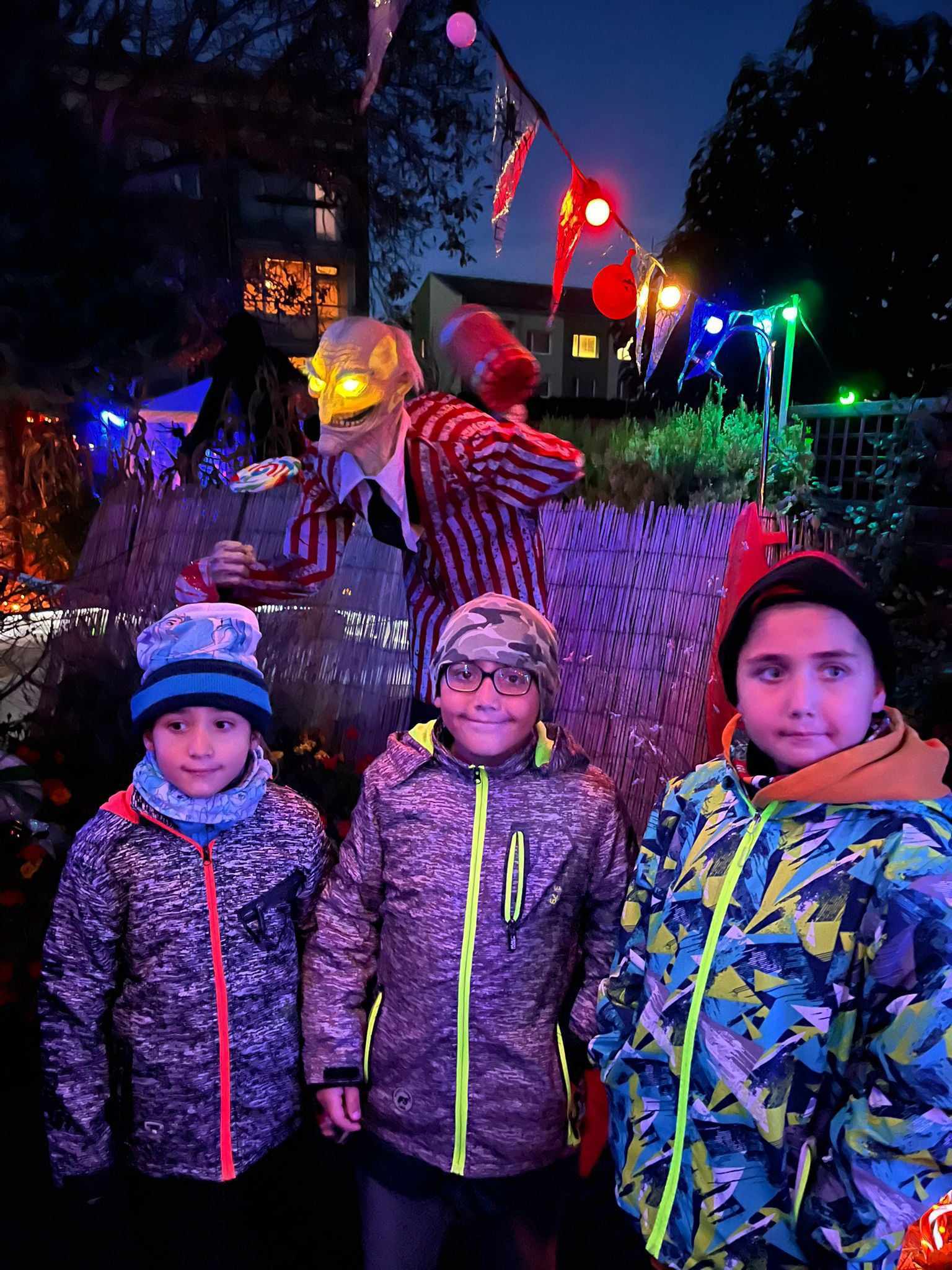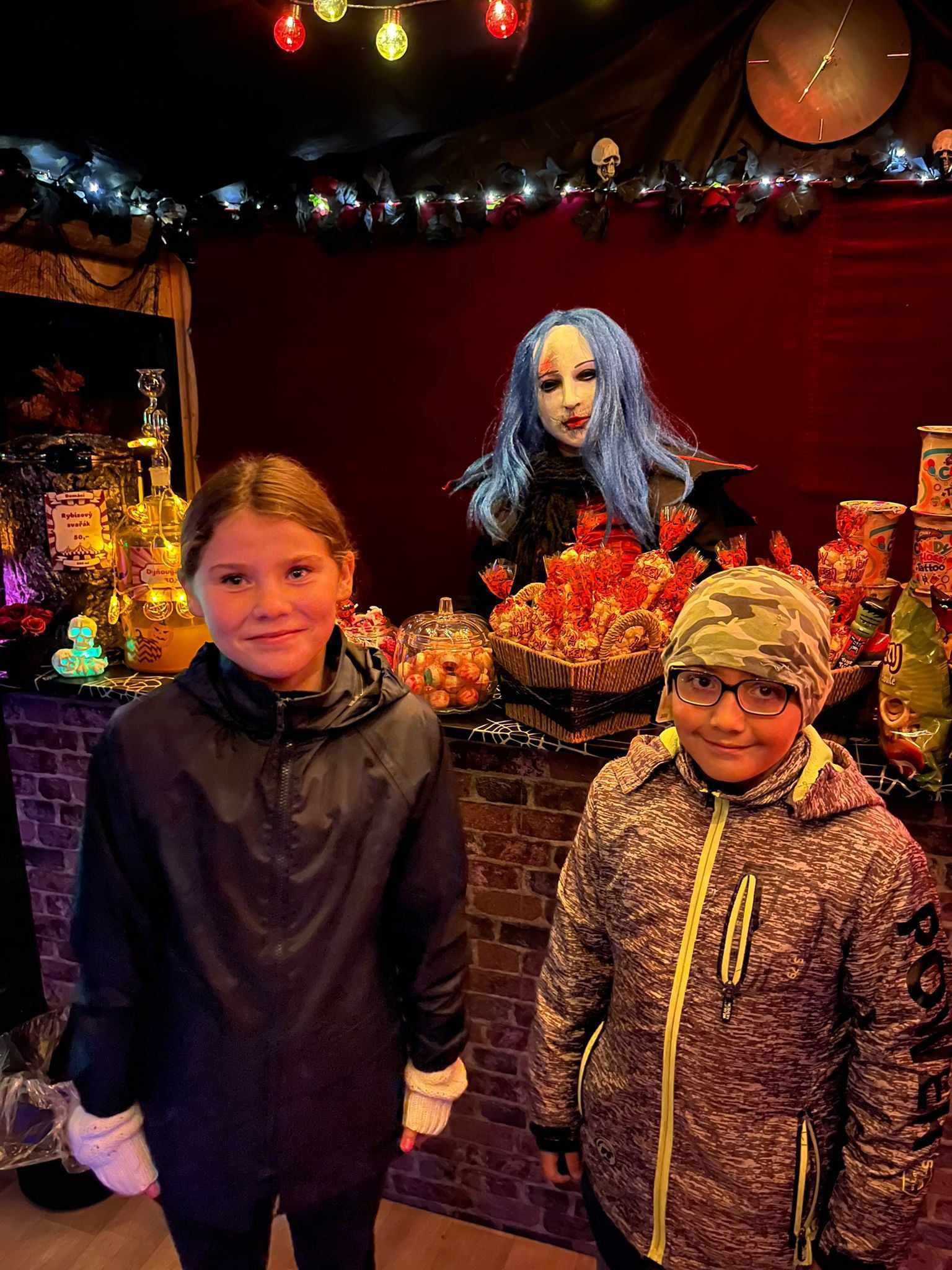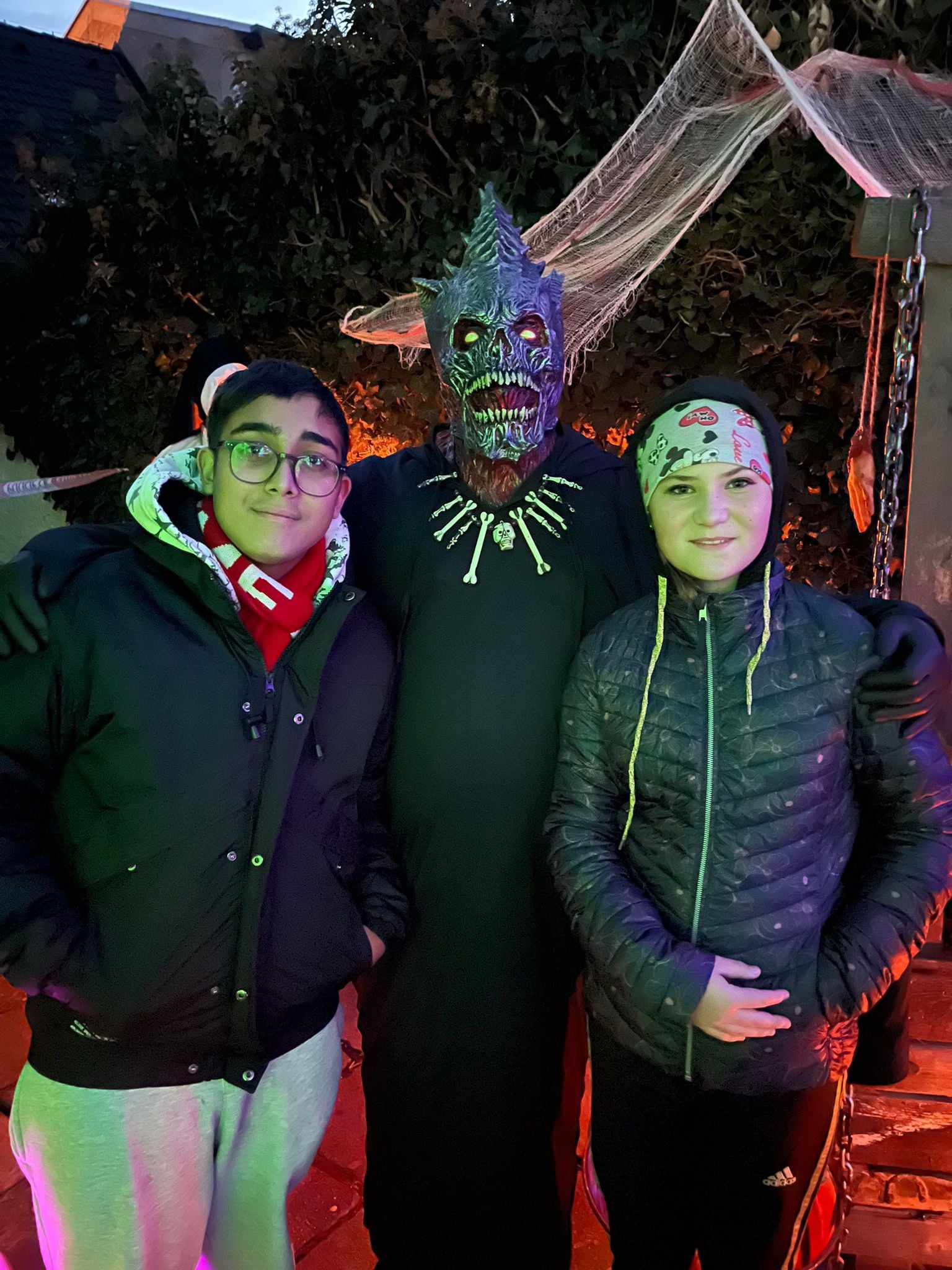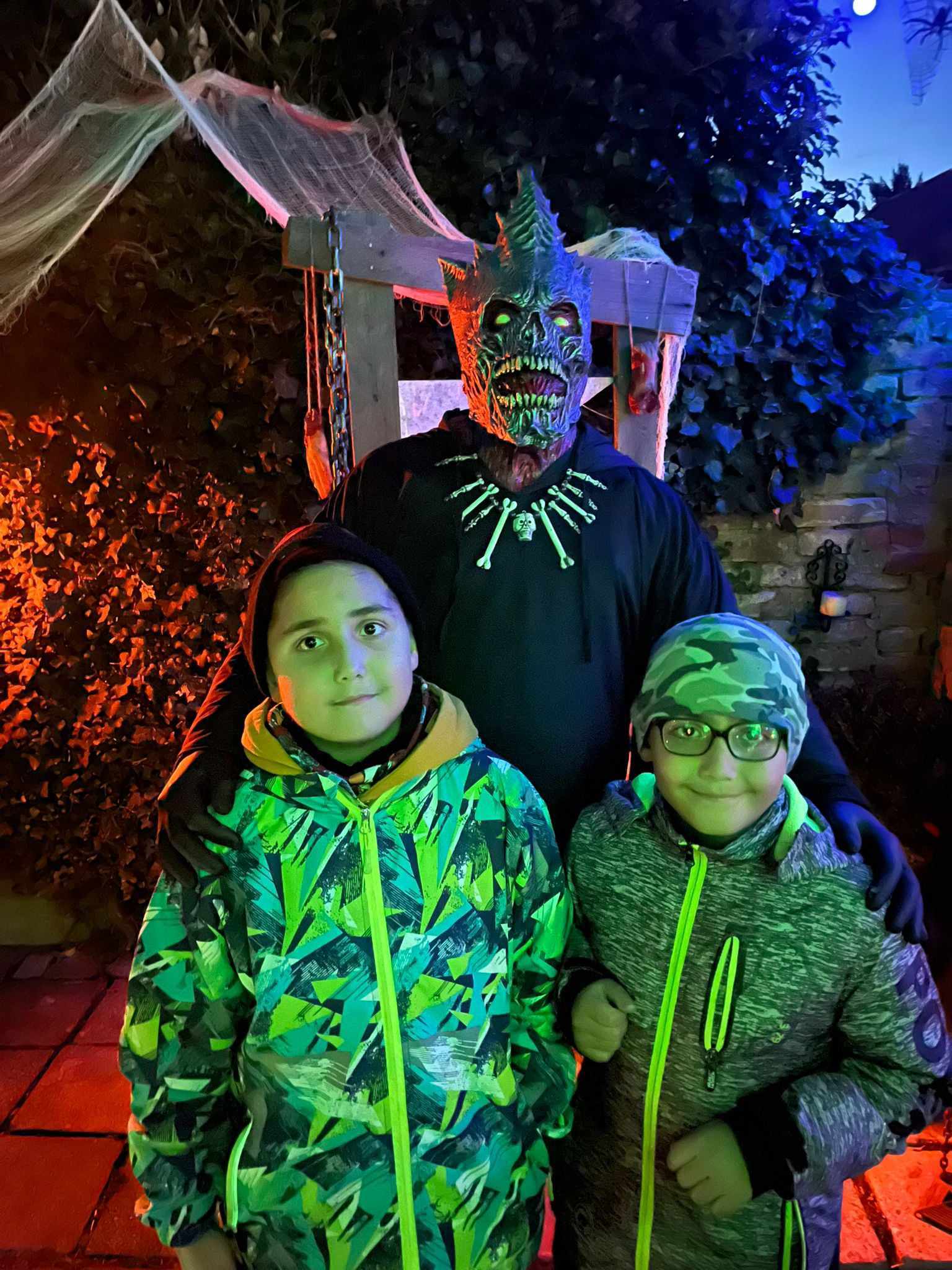 Večer v 18.30 jsme si udělali menší výlet, jeli jsme autobusem do Třebenic, prošli Mlýnskou uličkou do strašidelné zahrady. V zahradě se nacházely různá světýlka, vydlabané dýně, pavouci na pavučinách a obrovské stršidelné příšery, které se po tlesknutí rozhýbaly. Viděli jsme i živá strašidla, která se dětí dotýkala. Děti se s nimi i fotily. Malé děti se bály a trochu brečely, ale po chvíli se bát přestaly. Byl to velký zážitek i pro starší dívky a chlapce. Všem se to moc líbilo, ještě cestou domů si vyprávěli , co se jim nejvíce líbilo.